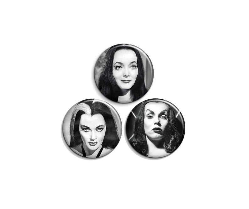 Morticia, Lily, Vampira set - pinback buttons, magnets or clips 1.5 Inch (38mm)